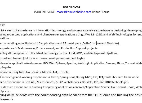 Hello, I hope this message finds you well. This is Moses Pandal from NMK Global Inc. Please find below the summary and attached resume of my consultant, Kishore, an …