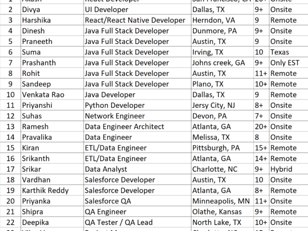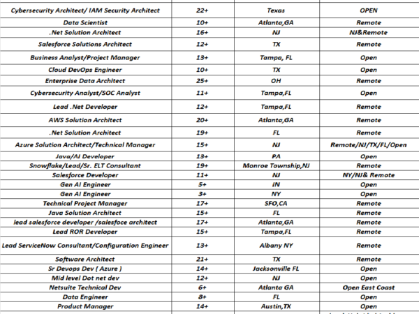 TECHNOLOGY EXP LOCATION ONSITE/REMOTE Senior BI Lead Architect 15+ WA Remote Lead ETL Developer 14+ FL EST// Remote Power platform Developer/Sharepoint 11+ Charlotte,NC Remote Full …