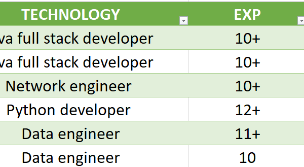Hello recruiters, We have a strong consultants on Java full stack developer, Java backend developer , Network engineering , Data engineering ,Senior python developer