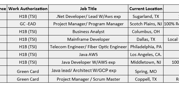 Hello Recruiters Please find the Updated hotlist You can reach me at Sachin.Singh@tanishasystems.com / 732-854-4358 Top Available Resources: ✅ Business Analyst – 8+ yrs – …