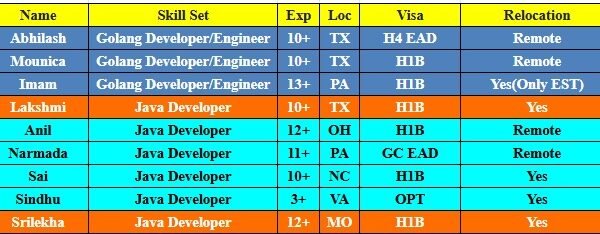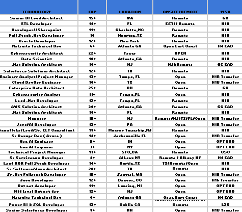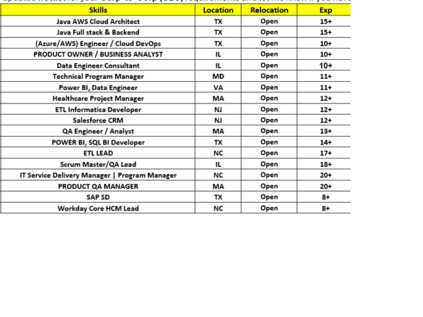 Hi, Greetings of the day, Please find the below Hot-List and share with me your daily C2C requirements to hsheik@codewaveit.com or you can reach on +1 (717) 970-9900. Please …
