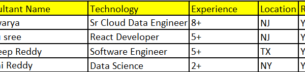 Hello Professional, Greetings to you, Please find the updated hot list and Kindly help us if you come across any C2C opportunities. Name Skill Years Visa Location …