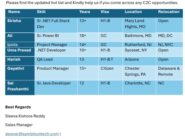 Greetings, Please find my updated hotlist of consultants currently available. Kindly let me know if you have any suitable openings. Also, please add me to …