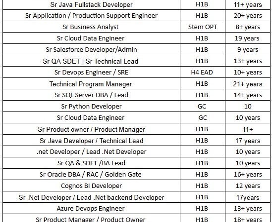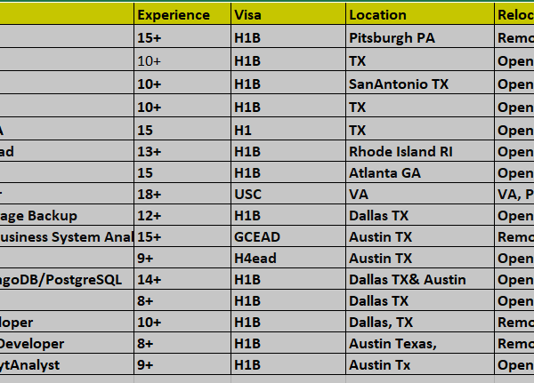 Technology Experience Visa Location Relocation Java Lead 10+ H1B TX Open Java Architect 15+ H1B PA Remote Sr Java Developer 10+ H1B SanAntonio TX Open …