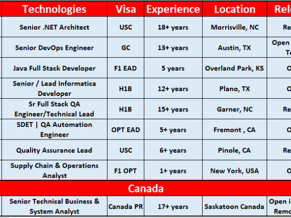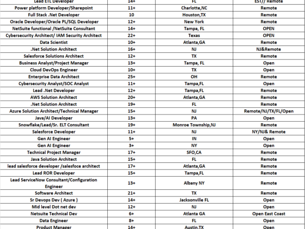 TECHNOLOGY EXP LOCATION ONSITE/REMOTE Senior BI Lead Architect 15+ WA Remote Lead ETL Developer 14+ FL EST// Remote Power platform Developer/Sharepoint 11+ Charlotte,NC Remote Full …
