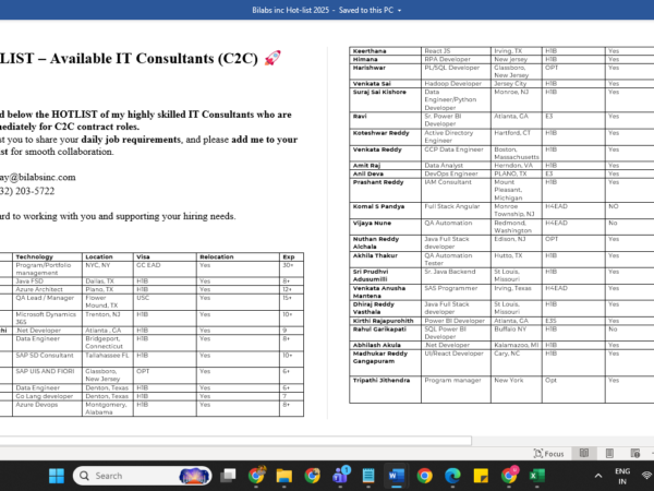 Hello Connections! I’m Siva from Care IT Services Inc. We’ve been in the IT industry since 2010, working primarily with W2 H1B, USC, GC, and H4 EAD consultants. …