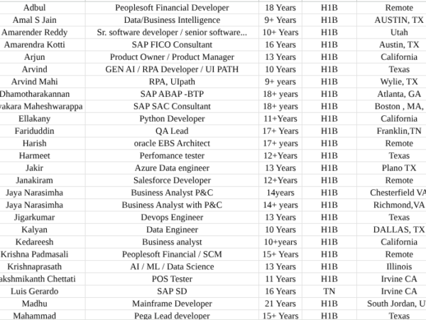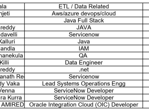 Hi Partners, Good day. Looking forward to closing positions together. Regards, Aswani Reddy Email: aswani.ecovues@gmail.com Phone: +1 6787127608 onsultant Name Technology Experience Location Work …