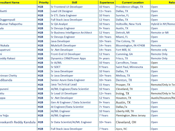 Good morning, please find our hotlist attached. If you have any suitable C2C requirements, reach out at meenakshi@solvency.us Name Role Visa Experience Location Relocation Kiran …