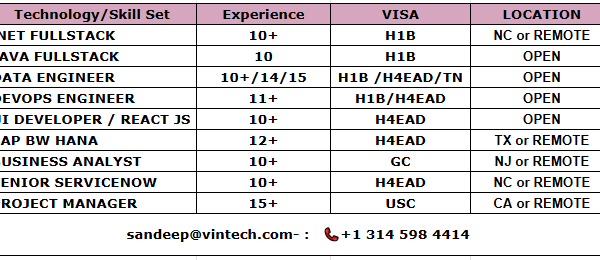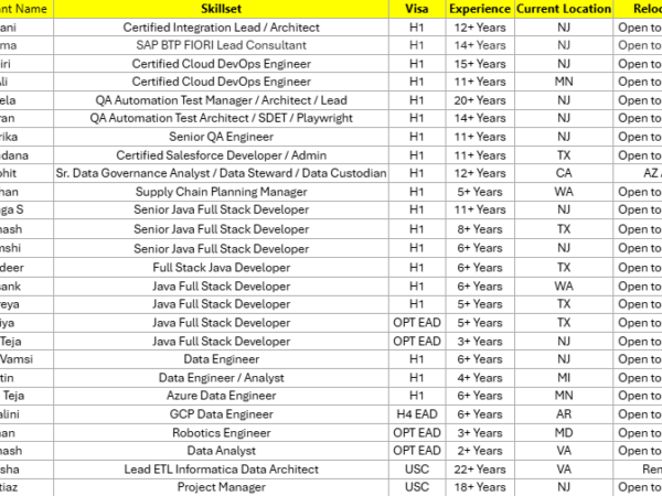 Hello Recruiters, Hope you are doing great!!! Please find the hotlist of my IT consultants who are available immediately for your contract (C2C) positions and I request you …