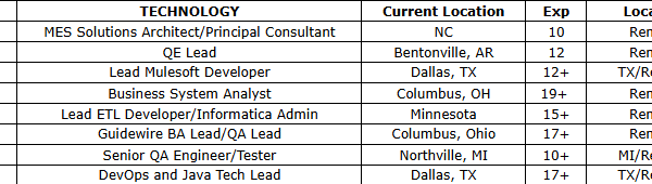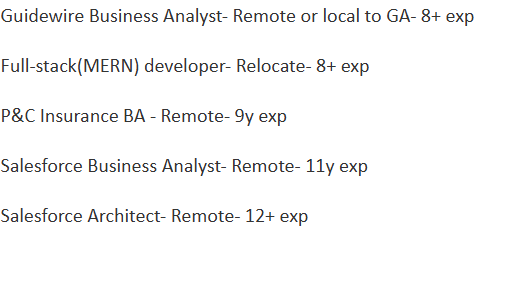 Guidewire Business Analyst- Remote or local to GA- 8+ exp Full-stack(MERN) developer- Relocate- 8+ exp P&C Insurance BA – Remote- 9y exp Salesforce Business Analyst- …