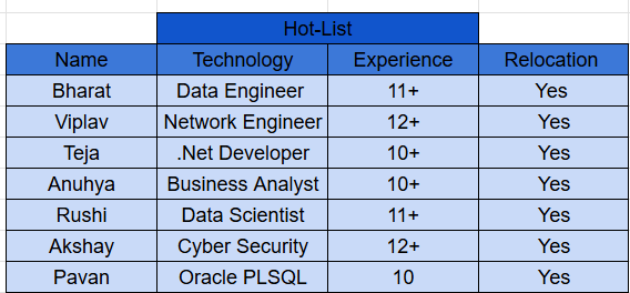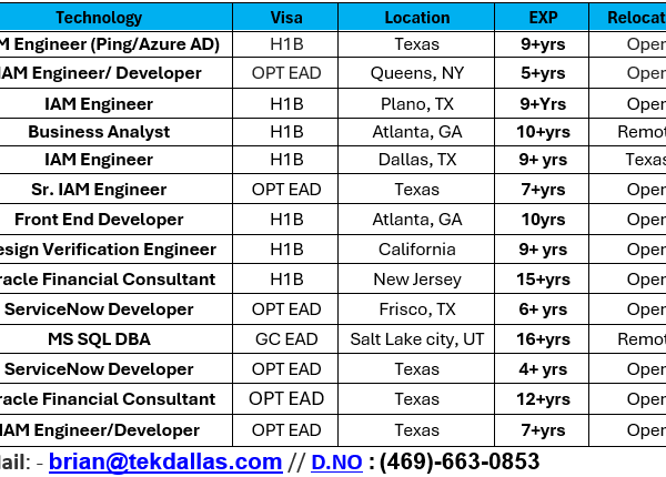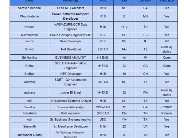 Hi Recruiters, Hope you are doing well. I have the following consultants available on the below technologies who are ready to join immediately and open to relocate anywhere …