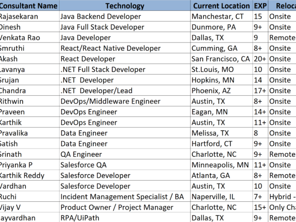 HI, I am reaching out to share our roster of immediately available C2C consultants across a wide range of technologies. All of our candidates are experienced, project-ready, …