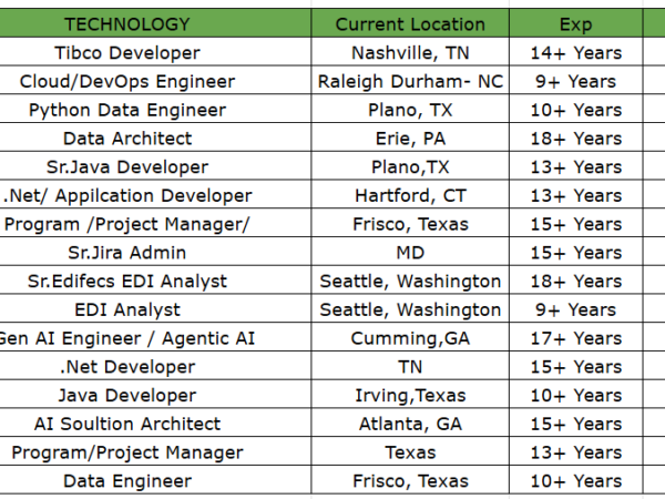 TECHNOLOGY EXP LOCATION ONSITE/REMOTE Senior BI Lead Architect 15+ WA Remote Data Engineer/Lead/Sr. ELT Consultant 19+ Monroe Township,NJ Remote Lead ETL Developer 14+ FL Remote …