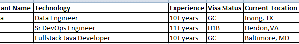 Hi, Hope you’re doing well. Greetings from Wise Equation Solution Inc….!! Please find the list of available consultants for your client requirements. We provide our …