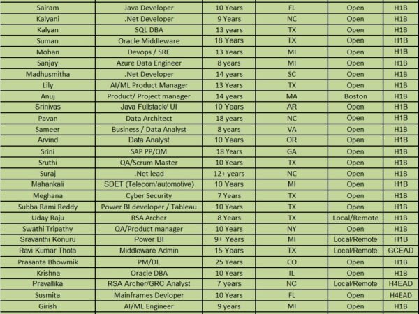 Hello Recruiters, Hope you are doing great!!! Please find the hotlist of my IT consultants who are available immediately for your contract (C2C) positions and I request you …
