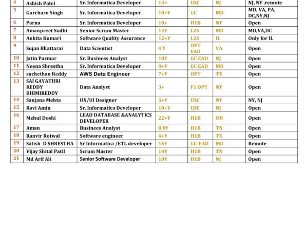 Hi, Hope you’re doing well. Greetings from Wise Equation Solution Inc….!! Please find the list of available consultants for your client requirements. We provide our …