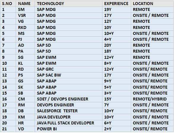 TECHNOLOGY EXP LOCATION ONSITE/REMOTE Senior BI Lead Architect 15+ WA Remote Data Engineer/Lead/Sr. ELT Consultant 19+ Monroe Township,NJ Remote Lead ETL Developer 14+ FL Remote …