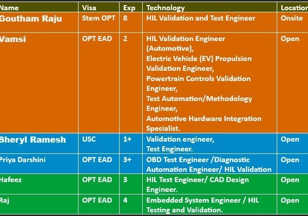 Name Visa Exp Technology Location Goutham Raju Stem OPT 8 HIL Validation and Test Engineer Onsite Vamsi OPT EAD 2 HIL Validation Engineer (Automotive), …