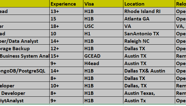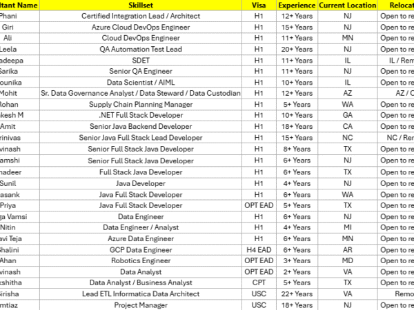 Name Technology Experience Visa Location Relocation Pavan SQL SSIS/MSBI Lead 13+ H1B Rhode Island RI Open Vinod Azure Architect 15 H1B Atlanta GA Open Deep …