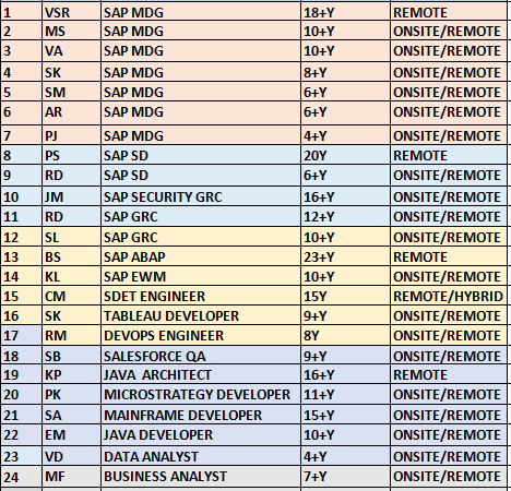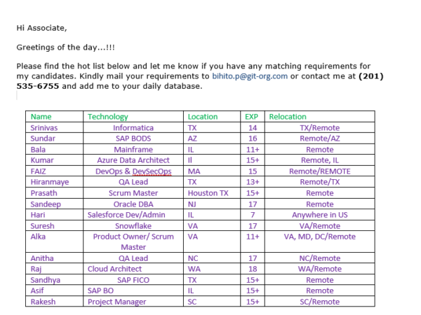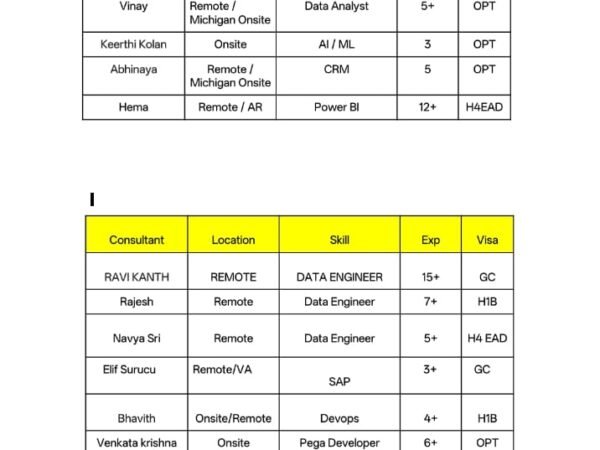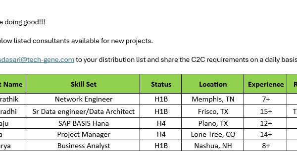 Hello, Hope you are doing good!!! I have the below listed consultants available for new projects. Please add sdasari@tech-gene.com to your distribution …