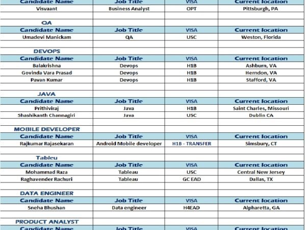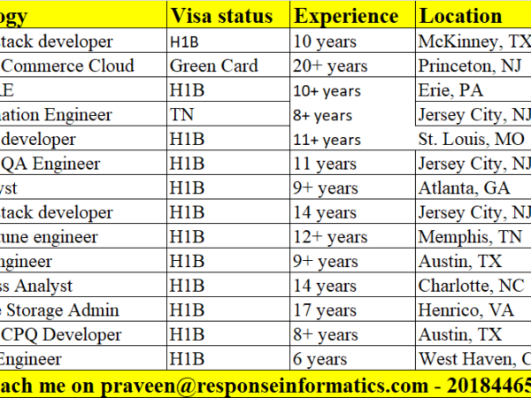 Dear Hiring Manager, Hope you are doing well Please check my updated hotlist and help me with suitable C2C requirements Name Technology Visa status Experience …