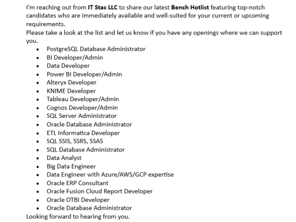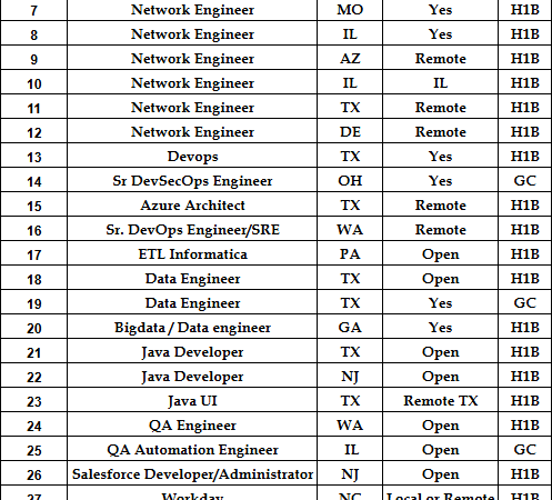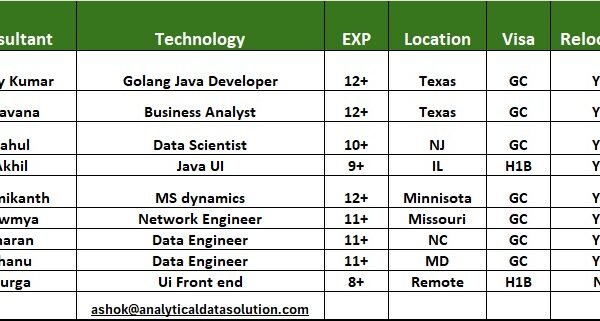 Hi Business partner, Hope you’re doing well..! Please find the below Hotlist of my TOP Priority Consultants who are actively available and can join immediately for …
