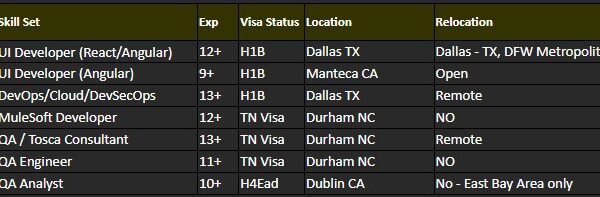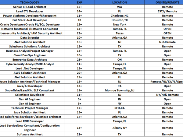 TECHNOLOGY EXP LOCATION ONSITE/REMOTE Senior BI Lead Architect 15+ WA Remote Lead ETL Developer 14+ FL EST// Remote Power platform Developer/Sharepoint 11+ Charlotte,NC Remote Full …