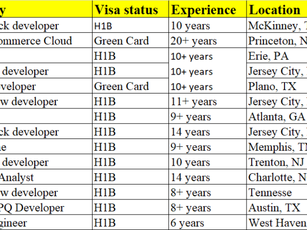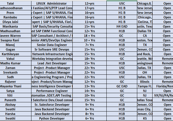 Dear Hiring manager Hope you are doing well Please check my updated hotlist and help me with suitable C2C requirements Name Technology Visa status Experience …