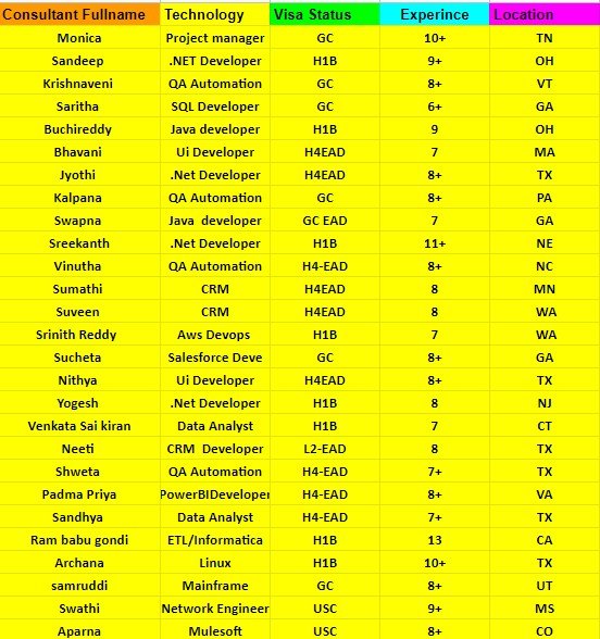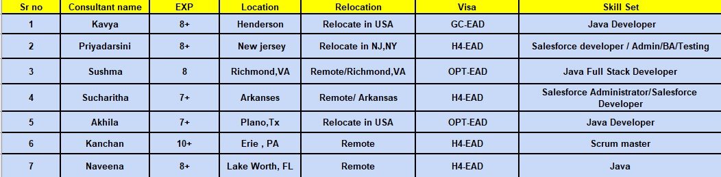 Hii, Good morning, This is Bob from Tekvivid, Hope you are doing great. I am attaching their resumes for reference. Kindly Use Reply All.(bob@tekvividinc.com) Here …