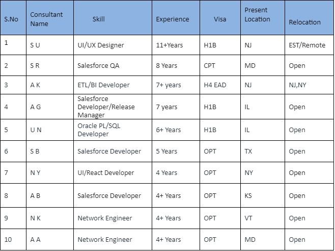 Please find IT Trailblazers Consultants who are available for a new project. Please add krupa@ittblazers.com and send me your requirements on a daily basis.