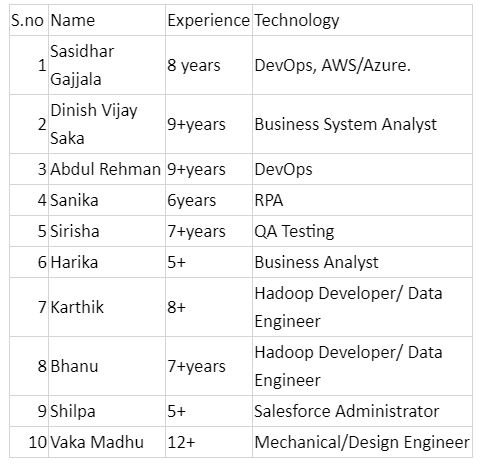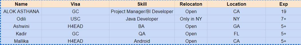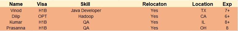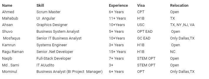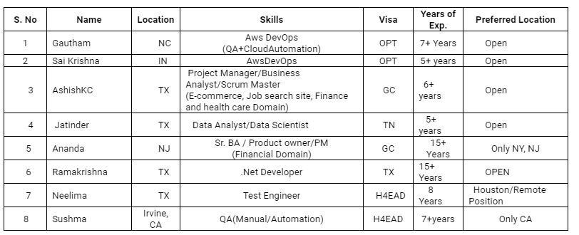 Consultant name JOB TITLE Experience Location Relocation Status Devi Prapulla Pinisetti SCCM Admin/Application Packager 9 years OH Only CA H1B Yeshwanth Akarapu Scrum Master 6+ …