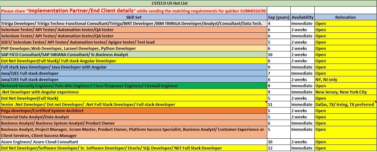 Hi All, Please have a look into below updated hotlist and send me your C2C requirements on a daily basis to john@lorhancorp.com Technology Name EXP P’Loc …
