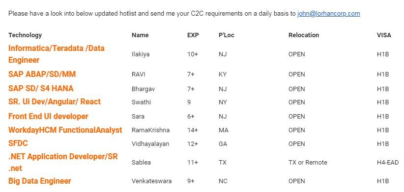 Hi All , We do have Consultants on our Bench with strong technical back-ground and excellent communication skills. Appreciate if you can share your direct …