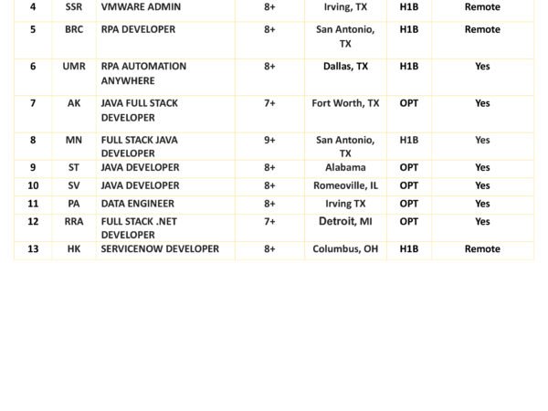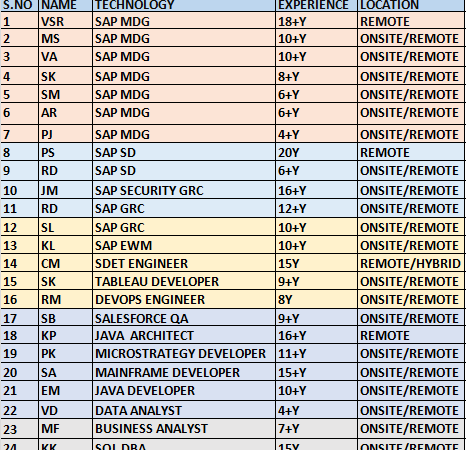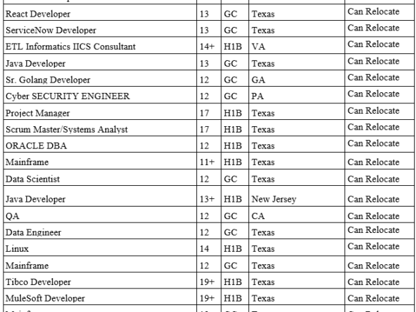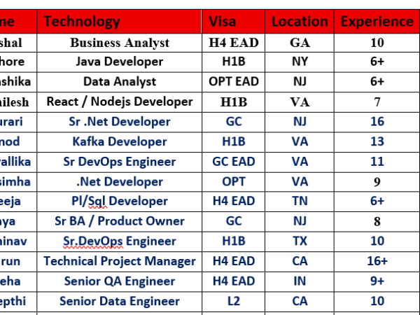 Hello, Here is our Hot List of Consultants available immediately for your client requirements. Mail id: abdul@vysoftinc.com I’m sharing a few strong C2C consultants available for …