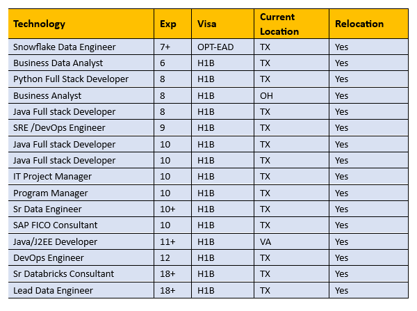 Hello, I hope you are doing well. Here is my list of candidates who are available. I would be grateful if you could inform me about any job openings that suit their skills and experience. Additionally, please add my email — balaraj@victoireus.Com to your mailing list so I can receive updates on future job opportunities. I look forward to collaborating with you and providing excellent candidates that meet your requirements. Technology Exp Visa Current Location Relocation …