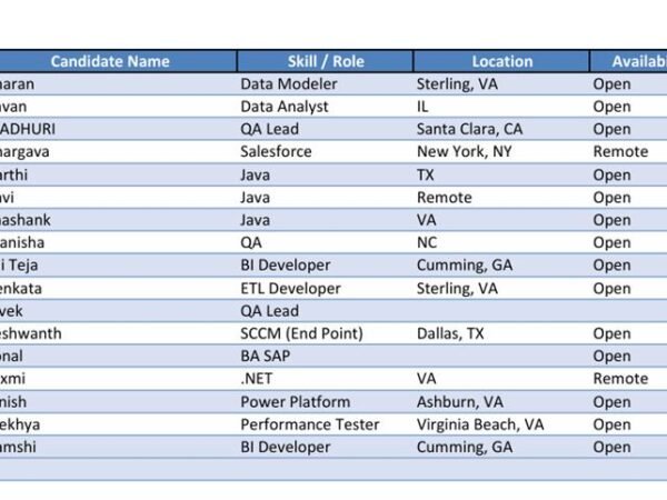 Hi, I hope you’re doing well! This is Sridhar from Blue Space Technologies, Inc. Please find the hotlist of my consultants available immediately for contract …