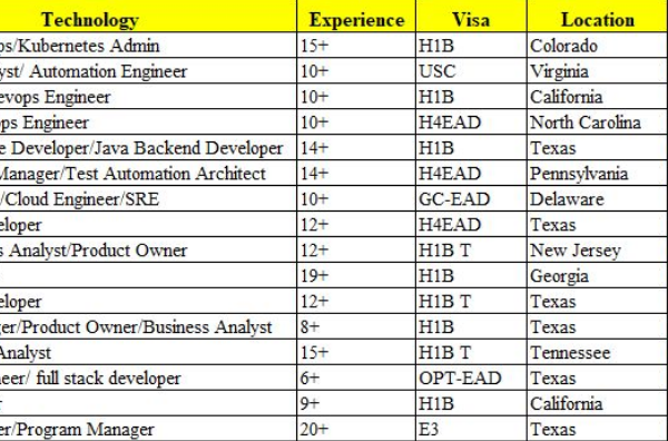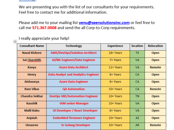 Hi Friends, Greetings! We are presenting you with the list of our consultants for your requirements. Feel free to contact me for additional information. Please …