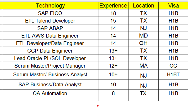 Hello recruiters, We have a strong consultants on Java full stack developer, Java backend developer , Network engineering , Data engineering ,Senior python developer