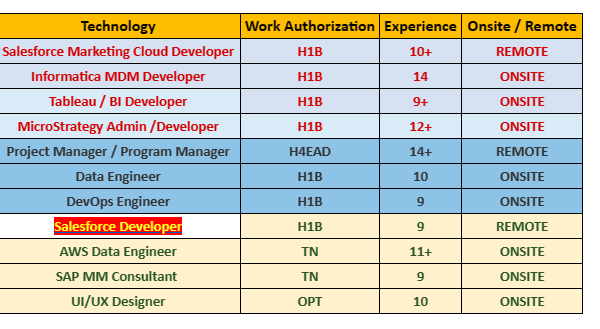 John KaryMarch 14, 2024March 14, 2024Salesforce Jobs HOTLIST, AWS Data Engineer, Informatica MDM Developer, Tableau / BI Developer Quick overview HOTLIST