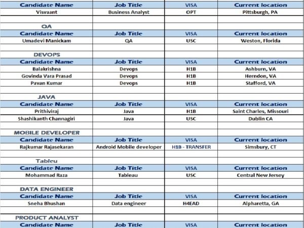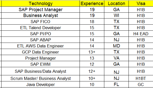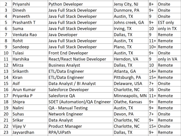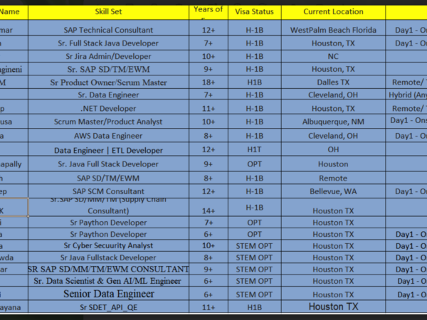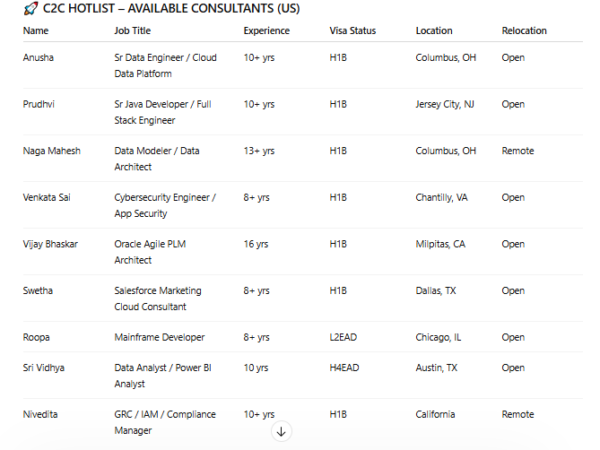 Hi, I hope you’re doing well! Please find the hotlist of my consultants available immediately for contract (C2C) positions. Kindly share your job requirements with …