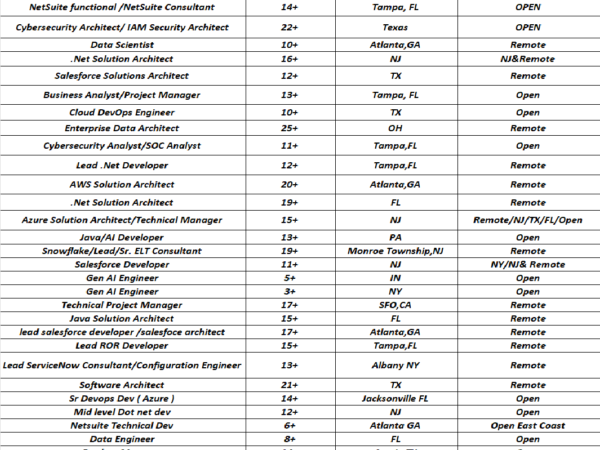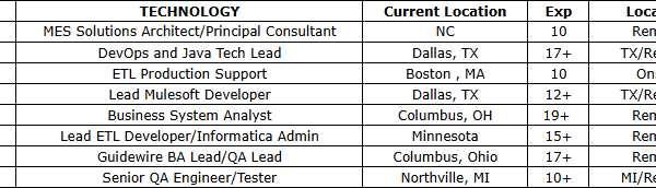 TECHNOLOGY EXP LOCATION ONSITE/REMOTE Senior BI Lead Architect 15+ WA Remote Lead ETL Developer 14+ FL EST// Remote Power platform Developer/Sharepoint 11+ Charlotte,NC Remote Full …