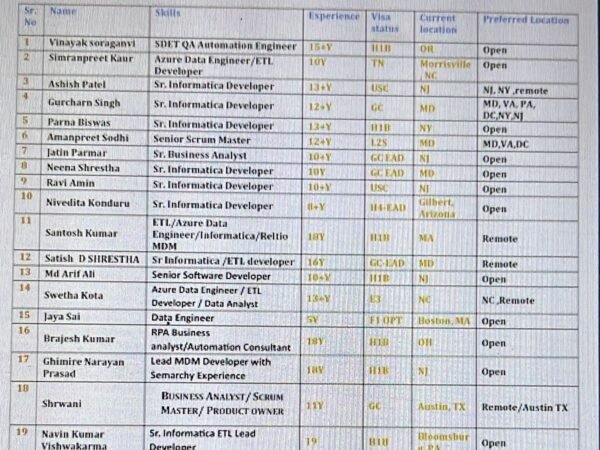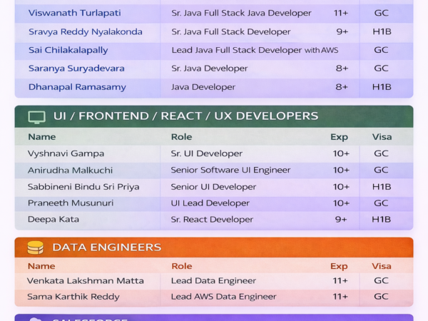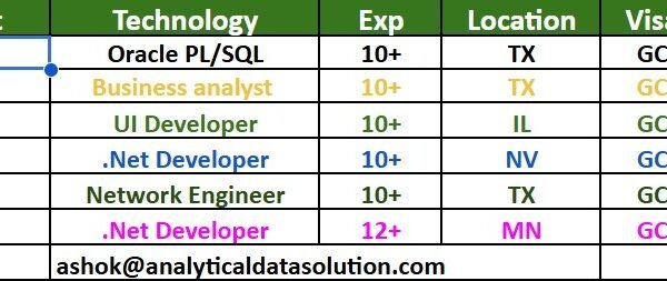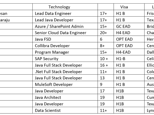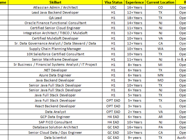 Hello Hiring Managers, Hope you are doing well. Please find the updated hotlist of bench candidates, actively looking for new projects on C2C. Help me …