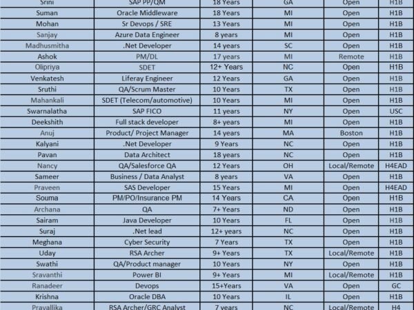 Hello Associate’s, Greetings!!! Please find the Bellow Hot List / Consultant details from Code Tech Inc. Please share me requirements to john@codetech-inc.com Phone:248-916-9851. Kindly let me know if you …
