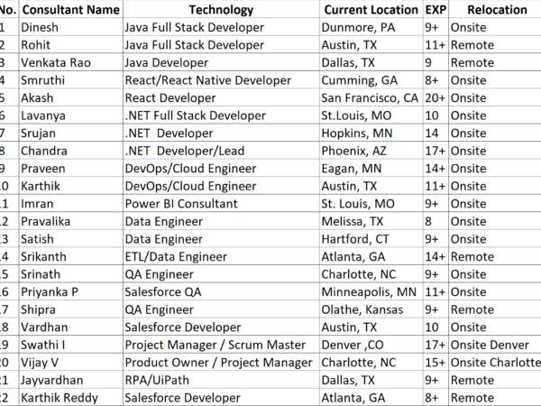 Hello Recruiters, Hope you are doing well, Greetings from CaritaTech, hashtagRecruiters, Hotlist Alert! Available Consultants Ready to Join Your Team! Looking for skilled IT professionals to …