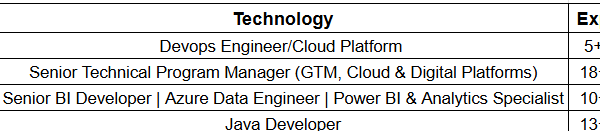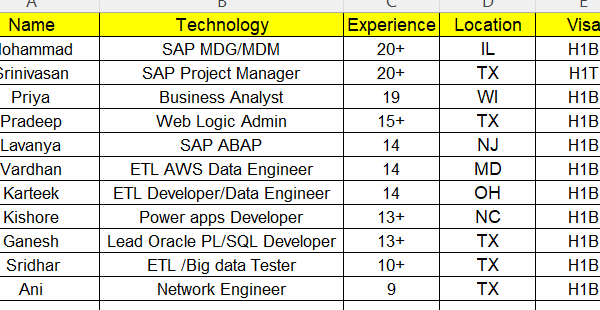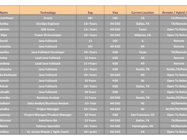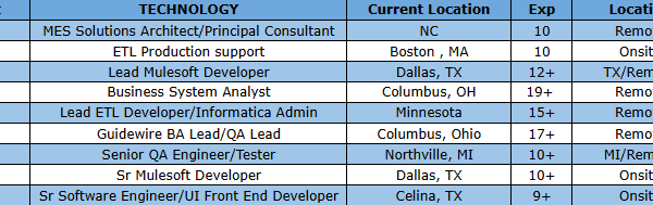 Hi Everyone, Hope you’re doing well. Please find below the list of our immediately available consultants for your client requirements. All are open for new opportunities and available …