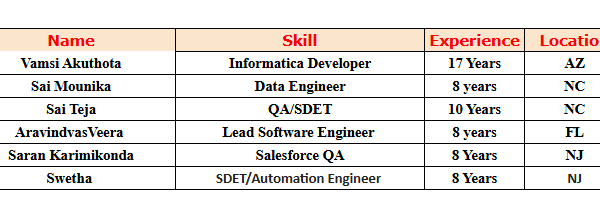 Hi Everyone, Hope you’re doing well. Please find below the list of our immediately available consultants for your client requirements. All are open for new opportunities and available for …