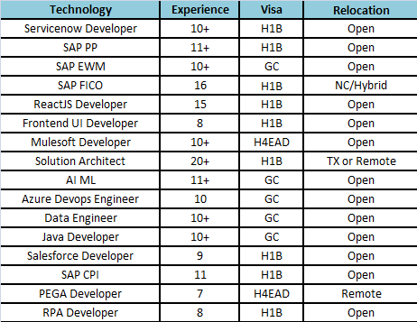 Please find the latest hotlist of our bench consultants who are actively looking for new projects. All candidates are available immediately and open to relocate.