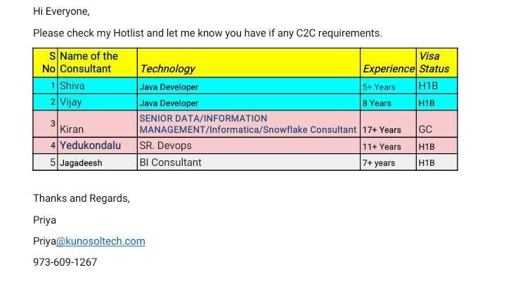 Hey Partner, Good Morning..! Hope you are doing well today, this is in reference to your company opportunities, few of my consultants are rolling off projects and we are …