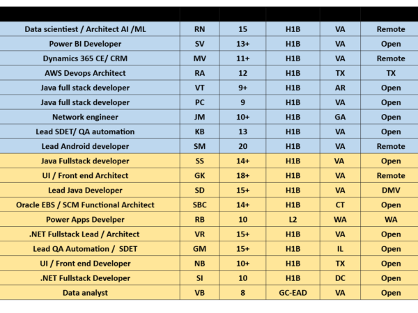 We currently have excellent and highly skilled resources available to support your client requirements across various technologies. Please find our updated hotlist of available bench …
