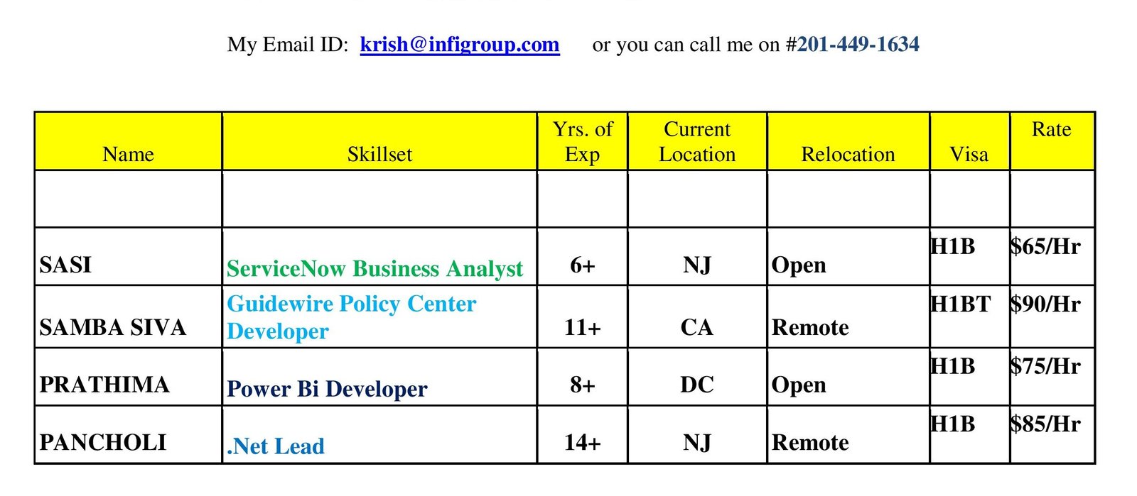 Hi… Hope you are doing great! Please share your Direct client Corp 2 Corp requirements to krish@infigroup.com or you can call me on #201-449-1634 (or) 315-274-2995